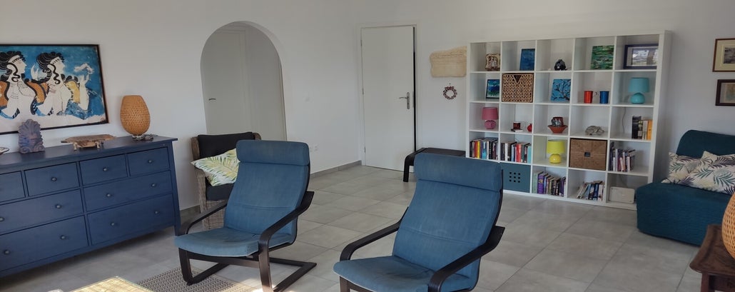 - een woonkamer met zeezicht en een schuifpui, die direct toegang geeft tot de enorme veranda, airconditioning, diverse fauteuils, een tweezitsbank, salontafel, boekenkast, tv & dvd-speler (dvd's aanwezig), (smart)tv met vele zenders.